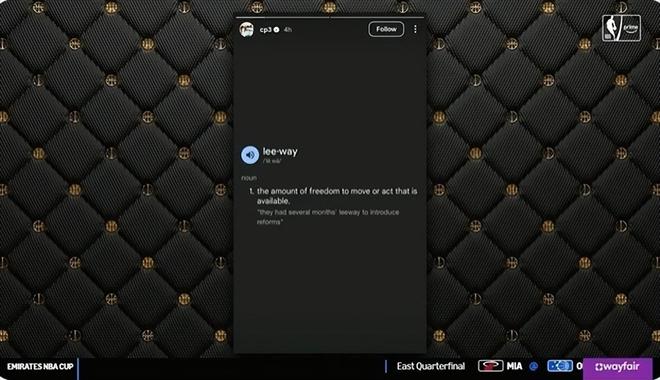 据我所知,杰夫-范甘迪当时明确告诉保罗:“在其他球队你或许有调整防守策略的自主权(leeway),但在这儿,你没有这个权限(leeway)。” 而这只是杰夫-范甘迪与保罗在快船共事这段短暂时间里,数次言语冲突中的一次小摩擦而已。结果,保罗就把leeway这个词的释义晒在了自己的社媒上。
