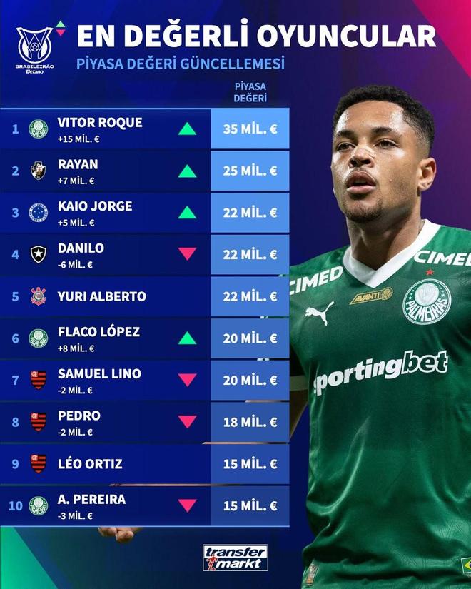 北京时间12月11日,在更新了巴甲球员的身价之后,德转列出了目前巴甲身价排名前10的球员,目前效力于帕尔梅拉斯的巴塞罗那旧将维托尔-罗克身价暴涨1500万欧元,以3500万欧元排名第一,效力于克鲁塞罗的尤文图斯旧将凯奥-若热2200万欧元并列第三,内马尔未进入前10。